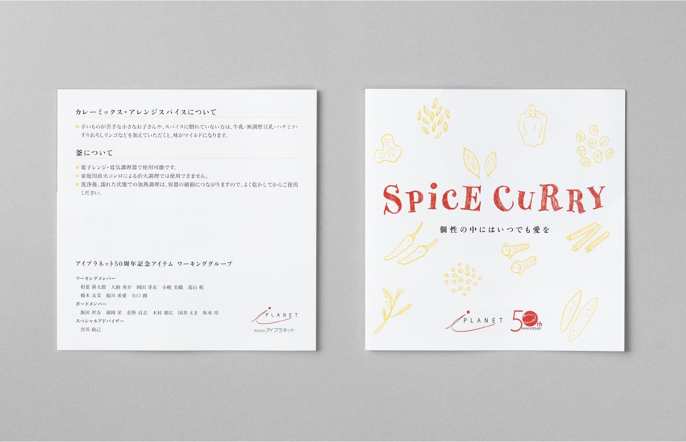 株式会社アイプラネット様の設立50周年記念に、カレースパイスを記念品として社員の皆様に配ることになり、そのパッケージ、ラベル、リーフレットのデザインをいたしました。