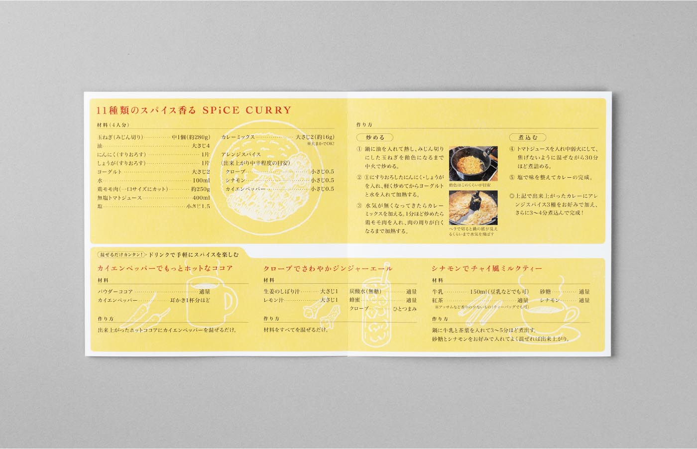スパイスの絵は手書きタッチのイラストで表現し、シンプルで洗練されたトーンの中にも暖かみを感じさせるデザインにしています。