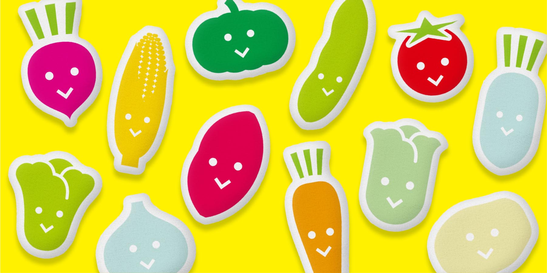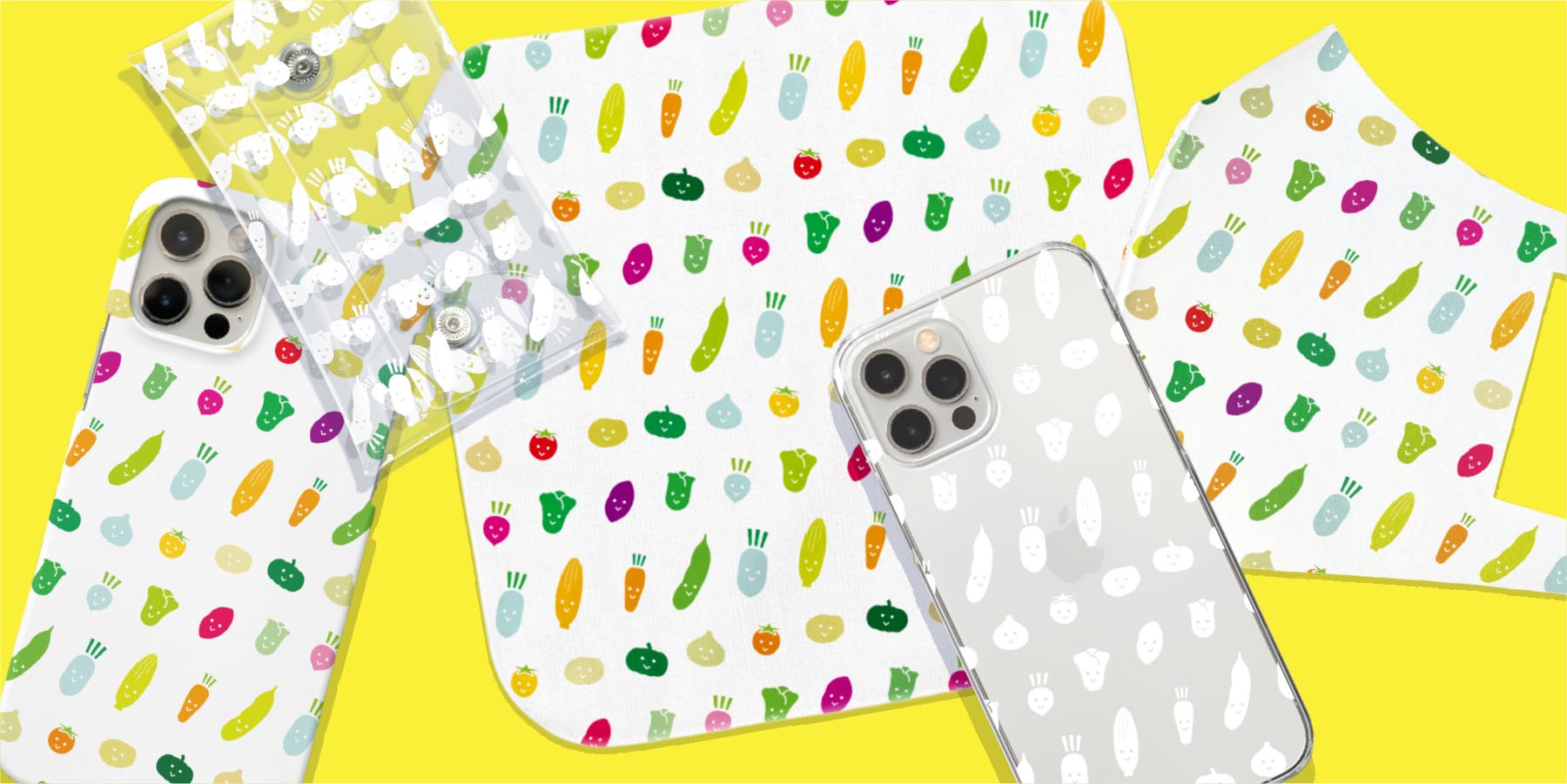 様々な野菜のイラストを全面に散りばめた、ポップで可愛らしいデザインのスマホケースや、タオルハンカチ、マスクなどを販売しています。