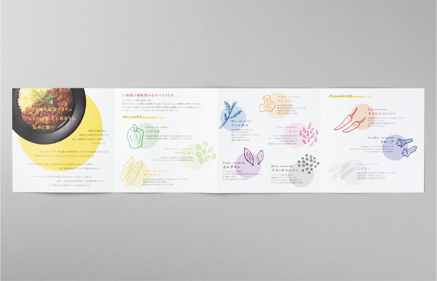 株式会社アイプラネット様の設立50周年記念に、カレースパイスを記念品として社員の皆様に配ることになり、そのパッケージ、ラベル、リーフレットのデザインをいたしました。
