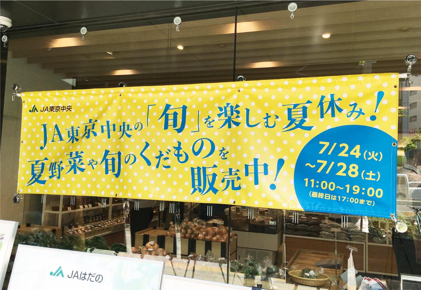 JA東京アグリパークで開催された「JA東京中央の旬を楽しむ夏休み!」イベントにおいて、店頭に掲示される横断幕を制作いたしました。