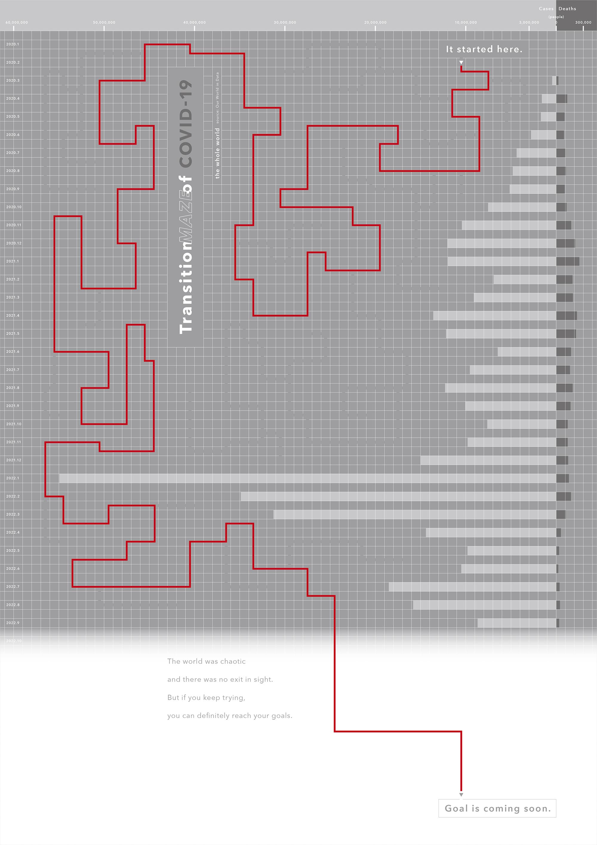 さらに、世界中の人々が混乱の渦に巻き込まれ、手探り状態で前へ進もうとしてきたことや、信じて進み続ければいずれゴールに辿り着くということを、迷路を組み合わせたグラフィックと重ね合わせて表現しています。